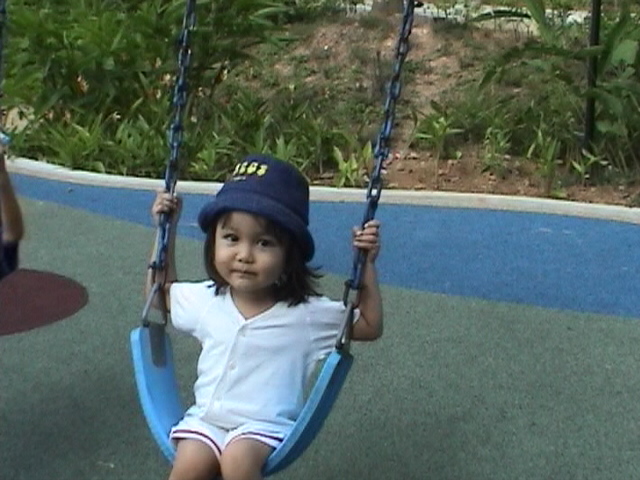 Playing with the swing in our apartment's playground, Normanton Park, Singapore.