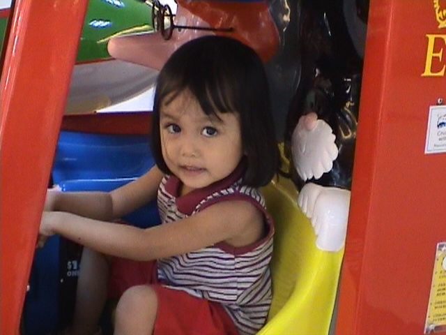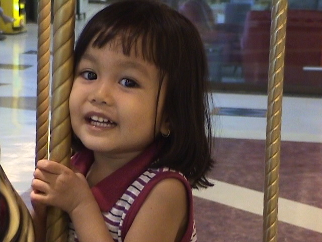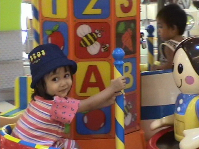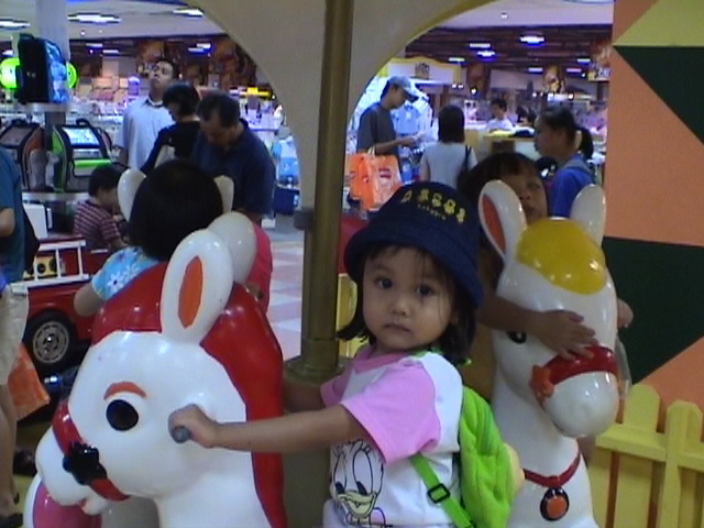 Riding the "Merry Go Round" kiddie ride at IMM Building, Jurong East, Singapore.