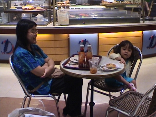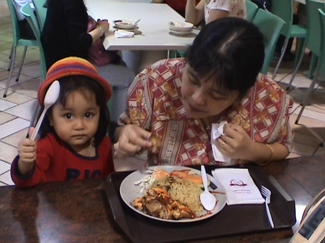 With my mother, having our dinner at a food court in Raffles City Shopping Center, Singapore.