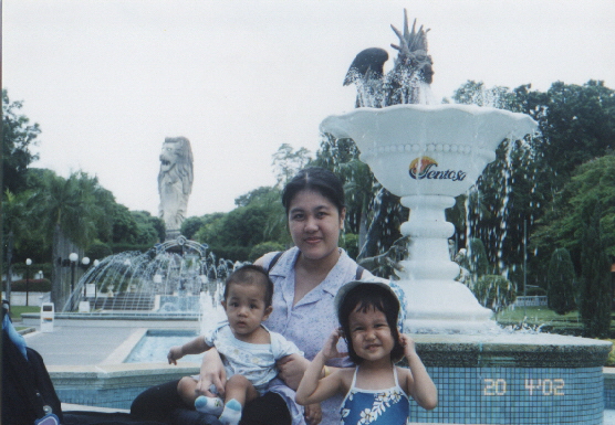 With my mother and my little brother, at Fountain Gardens, Sentosa Island, Singapore, overlooking the majestic Merlion tower.